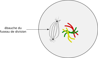 d’ADN et progresse dans les 2 sens au niveau des yeux de réplication. ![]() La réplication de l'ADN ![]() Schéma de d'une cellule en interphase Ensuite intervient la mitose : La Prophase : Les chromosomes se condensent (et deviennent visible au microscope électronique). Les microtubules apparaissent. L’enveloppe nucléaire disparaît progressivement. Les microtubules s’attachent au centromère des chromosomes. Le fuseau de division se forme. Rappel : schéma d’un chromosome condensé ![]() Structure dun chromosome à 2 chromatides (durant la mitose) Définition microtubule : Les microtubules sont des cylindres creux constitués de protéines fibreuses. Ils font partie du cytosquelette de la cellule. Ils ont plusieurs rôles : maintien de la forme cellulaire en créant un squelette rigide (appelé cytosquelette), « rails » sur lesquels les organites associés à des protéines motrices peuvent se déplacer... ![]() ![]() ![]() Schémas des étapes successives de la prophase La Métaphase : Les chromosomes sont condensés au maximum. Les chromosomes alignent leur centromère formant ainsi la plaque équatoriale. Les mouvements des chromosomes sont dus aux microtubules qui « tractent » les chromosomes. ![]() Schéma de la métaphase L’Anaphase : Le centromère dédoublé de chaque chromosome se sépare en deux, libérant ainsi les chromatides sœurs. Chaque chromatide devient un chromosome à part entière qui est ensuite « tiré » vers les pôles par les microtubules. A la fin de cette phase, les pôles possèdent un nombre équivalent